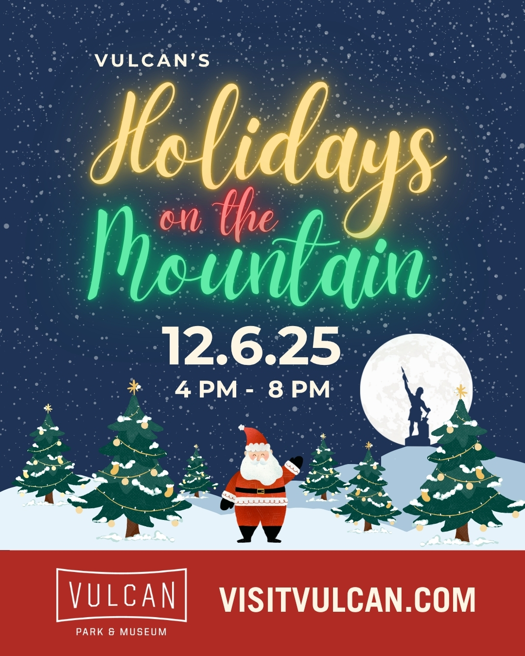 BIRMINGHAM, AL – Vulcan Park & Museum will introduce a new seasonal tradition with the debut of Vulcan’s Holidays on the Mountain on Saturday, December 6, from 4 PM to 8 PM. Guests are invited to enjoy an evening of lights, music, and family-friendly activities from the top of Red Mountain.
